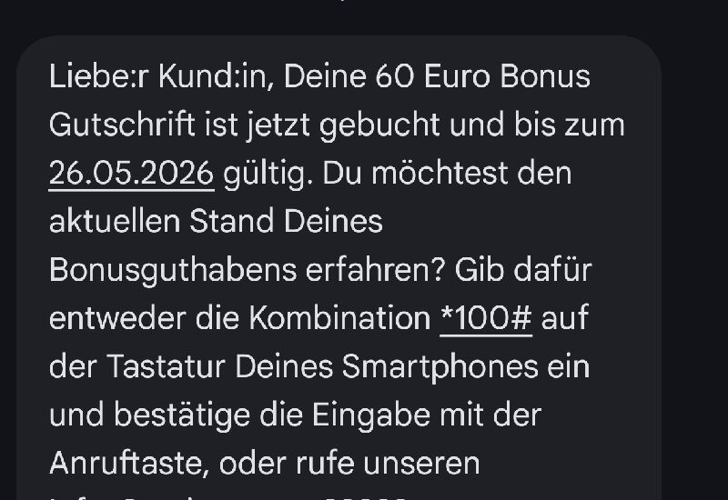 Damit ihr sicher wisst, dass die 60€ gebucht sind, nutzt den USSD-Code. Öffnet euer Tastenfeld am Handy, tippt *100# ein und drückt die Anruftaste. Euer aktueller Kontostand erscheint sofort auf dem Display. - Treue-Bonus für Vodafone-Kunden: