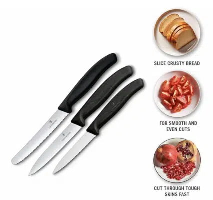 Das dreiteilige Victorinox Swiss Classic Set bietet mit einem Brötchenmesser mit Wellenschlifff , einem Gemüsemesser mit Mittelspitz und einem Tomaten- oder Tafelmesser mit Wellenschliff, die perfekte Grundausstattung für präzises Schneiden im Alltag. Die rostfreien Klingen garantieren extreme Schärfe, während die ergonomischen und leichten Griffe für eine sichere Handhabung sorgen. Dank der gewohnten Schweizer Markenqualität sind die Messer besonders langlebig und für eine mühelose Reinigung spülmaschinengeeignet. Ein kompaktes und funktionales Trio, das bewährte Qualität direkt in deine Küche bringt.