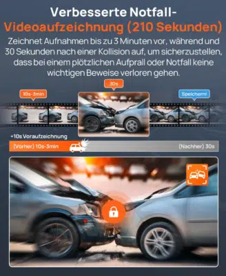 - ⏳ Verlängertes Pre-Recording: Bei einem Unfall speichert die Dashcam nicht nur die Zeit danach, sondern puffert nun auch bis zu 3 Minuten davor.