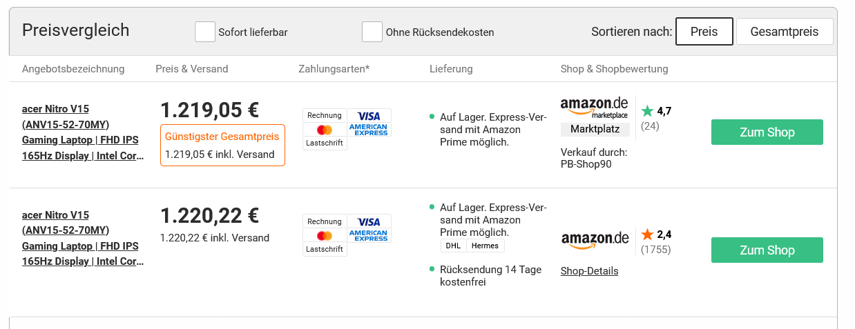 - Preisvergleich: 1127€ ➜ 256€ Ersparnis
