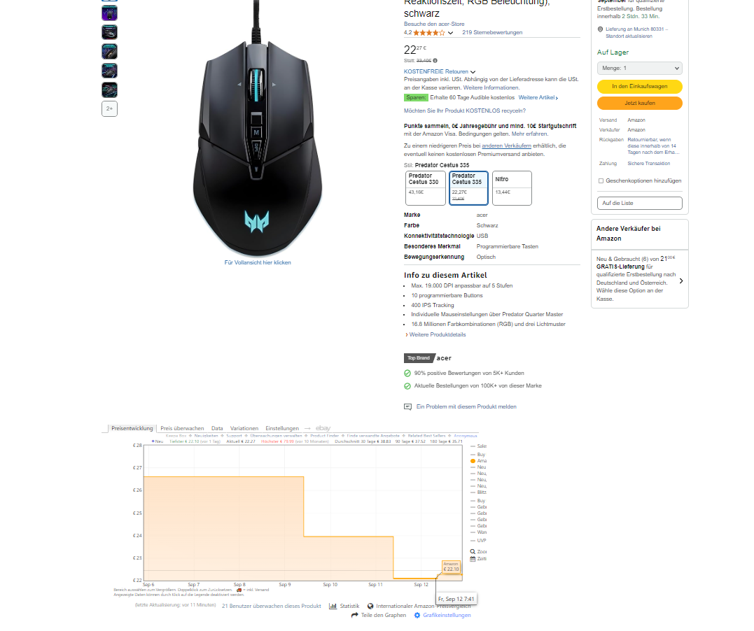 Das ist mal ein starker Preis für eine Gamingmaus von Acer! Die Predator Cestus 335 ist aktuell bei Amazon für gerade mal 22,27€ (!) erhältlich. Im Preisvergleich werden bei anderen Händlern mindestens 69€ fällig – also happige 47€ mehr! 😱