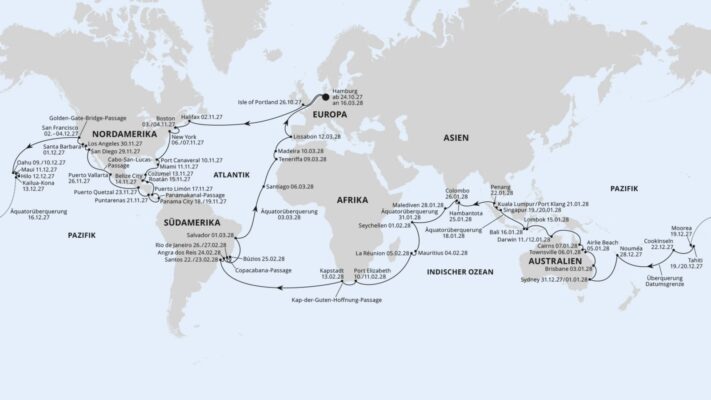 - Die Weltreise startet am 24. Oktober 2027 in Hamburg und endet dort wieder am 16. März 2028.