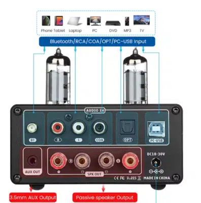 - 📻 Hybrid-Design: Kombiniert zwei 6K4-Vakuumröhren (Vorstufe) mit einem digitalen Class-D-Verstärkerchip (Endstufe) für eine Mischung aus Wärme und Effizienz.