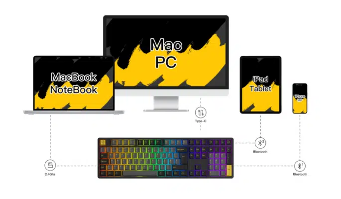 Die „B Plus“ Serie steht für maximale Freiheit. Ihr könnt die Tastatur per Kabel am Gaming-PC nutzen, per 2.4 GHz Dongle am Laptop und per Bluetooth am Tablet oder Fernseher. Das Umschalten funktioniert per Tastenkombination (Fn + Tasten) fast verzögerungsfrei. Besonders der 2.4 GHz Modus ist für Gamer wichtig, da er so stabil und schnell wie eine Kabelverbindung ist.