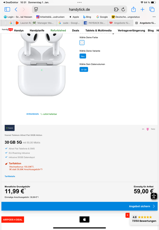 - Alternative: AirPods 4 (Standard) für 5€ + 30GB Telekom 5G Flat für 11,99€/Monat