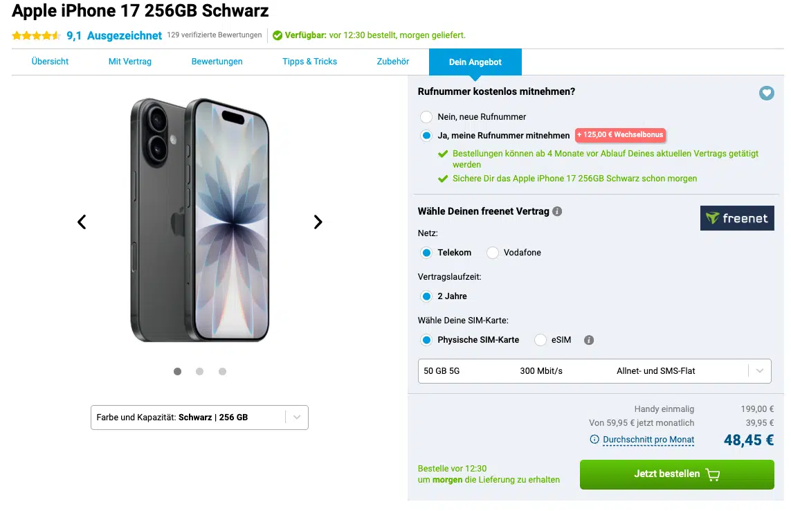 Der Tarif startet in dieser Aktion sofort. Das ist ideal, wenn ihr euer neues iPhone 17 direkt auspacken und mit voller 5G-Power im Telekom-Netz loslegen wollt.