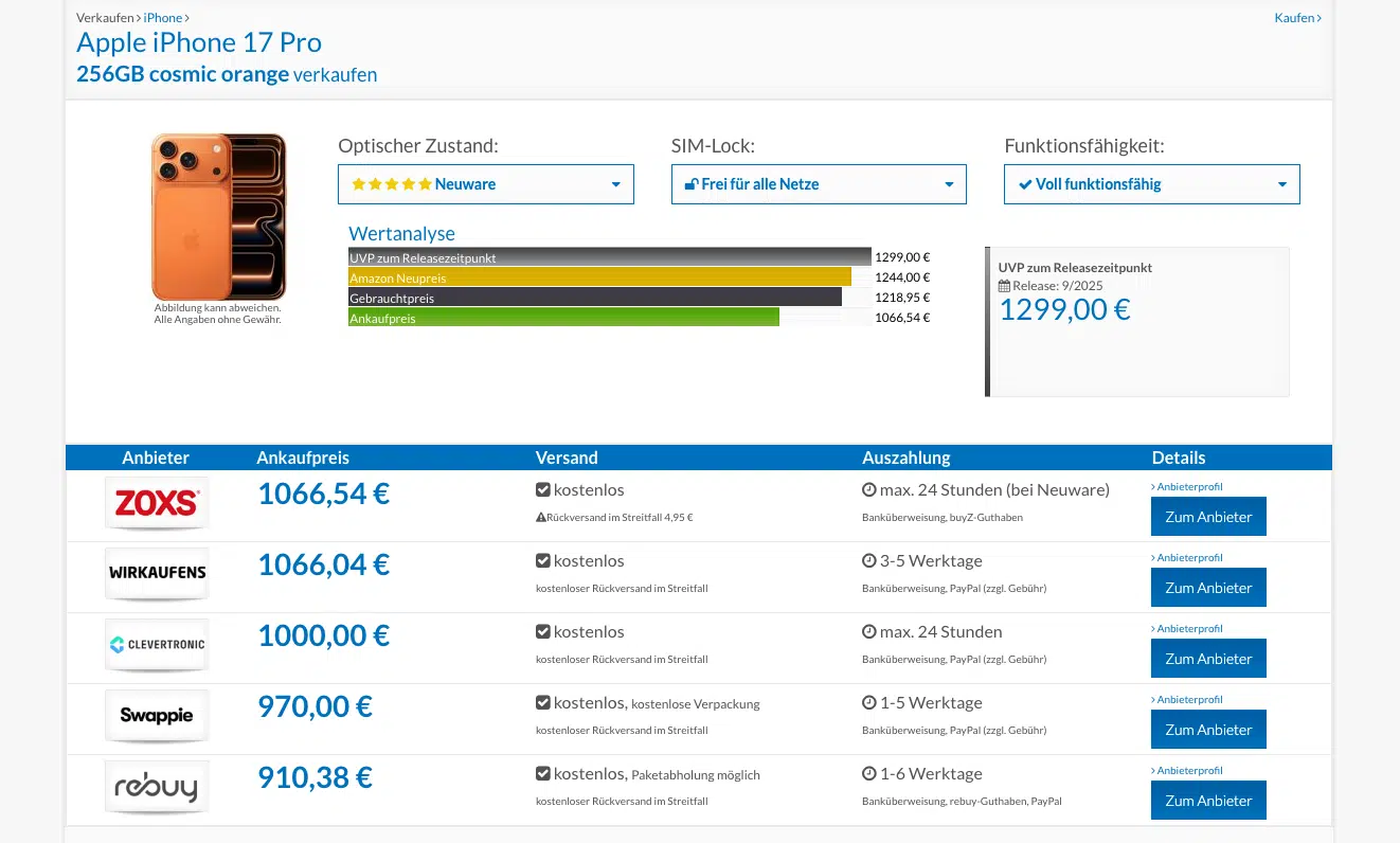 FĂŒr alle, die das iPhone 17 Pro gar nicht selbst nutzen wollen, ist dieser Deal ein echtes GoldstĂŒck. Verkauft ihr das unbenutzte GerĂ€t direkt an ein Ankaufsportal weiter, sieht die Rechnung extrem schmackhaft aus. Aktuell zahlen Portale fĂŒr ein versiegeltes iPhone 17 Pro (256GB) nĂ€mlich ĂŒber 1000⏠(ca. 1067âŹ).
