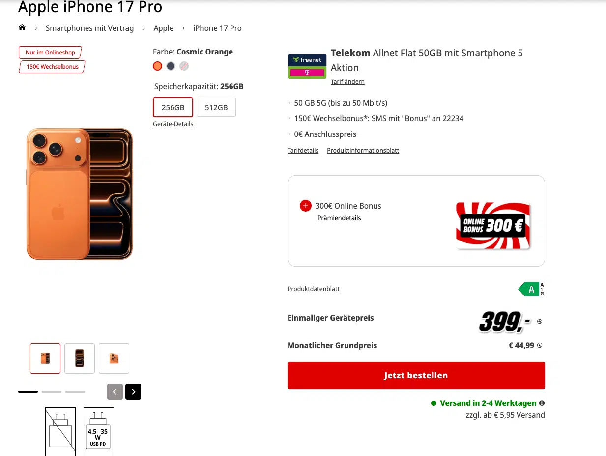 Ihr wollt euch das iPhone 17 Pro mit 256GB zulegen â am besten in der neuen Farbe Cosmic Orange? Das bekommt ihr jetzt bei MediaMarkt fĂŒr 399⏠Zuzahlung zusammen mit einer 50GB 5G Allnet-Flat im Telekom-Netz fĂŒr 44,99âŹ.