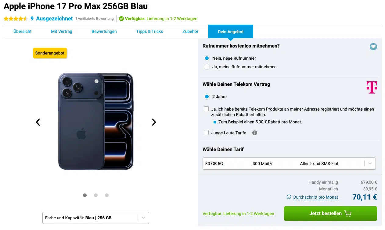 - Smartphone: Apple iPhone 17 Pro Max 256GB (aktuelles Top-Modell)