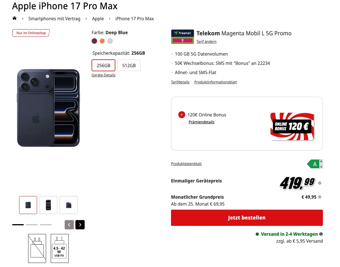 - Apple iPhone 17 Pro Max (256GB) für 419,99€ + 100GB 5G für 49,95€/Monat