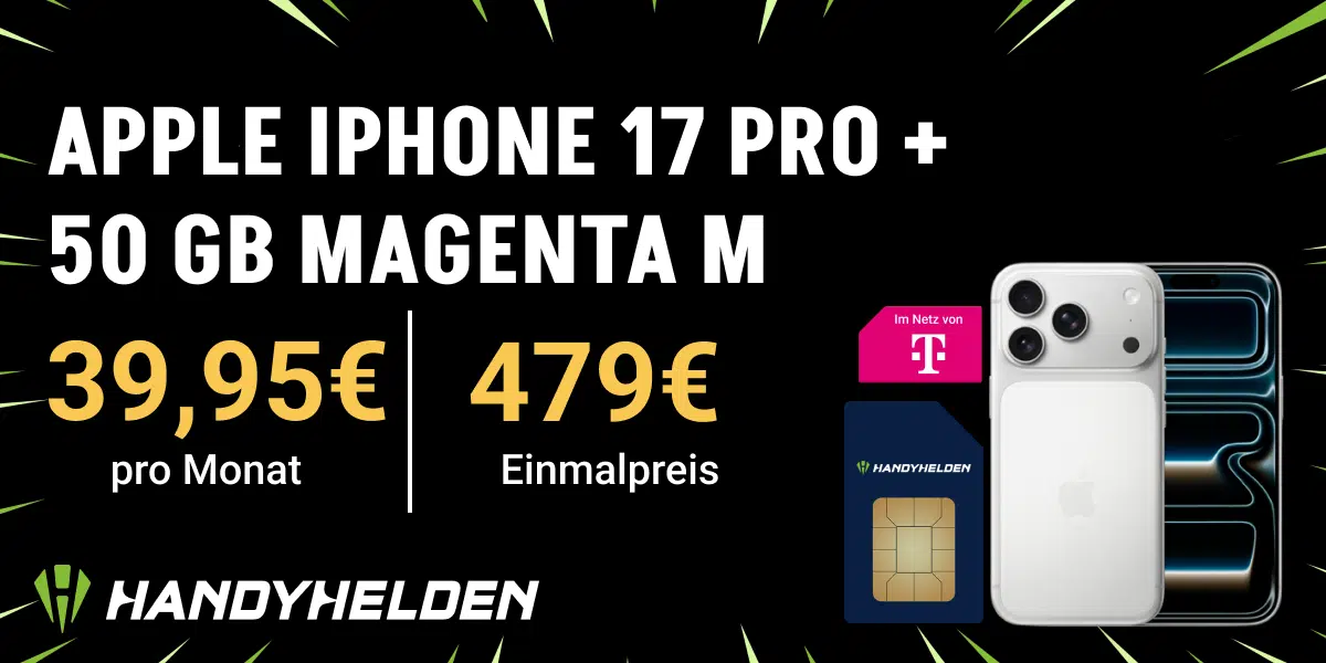 Bock auf das neue iPhone 17 Pro und auf der Suche nach einem neuen Tarif? Dann schaut bei Handyhelden vorbei: Ihr bekommt das iPhone 17 Pro im Telekom Magenta M Tarif mit 50GB Datenvolumen, 150€ Wechselbonus und dazu eine Grundgebühr von nur 39,95€ monatlich. 🔥
