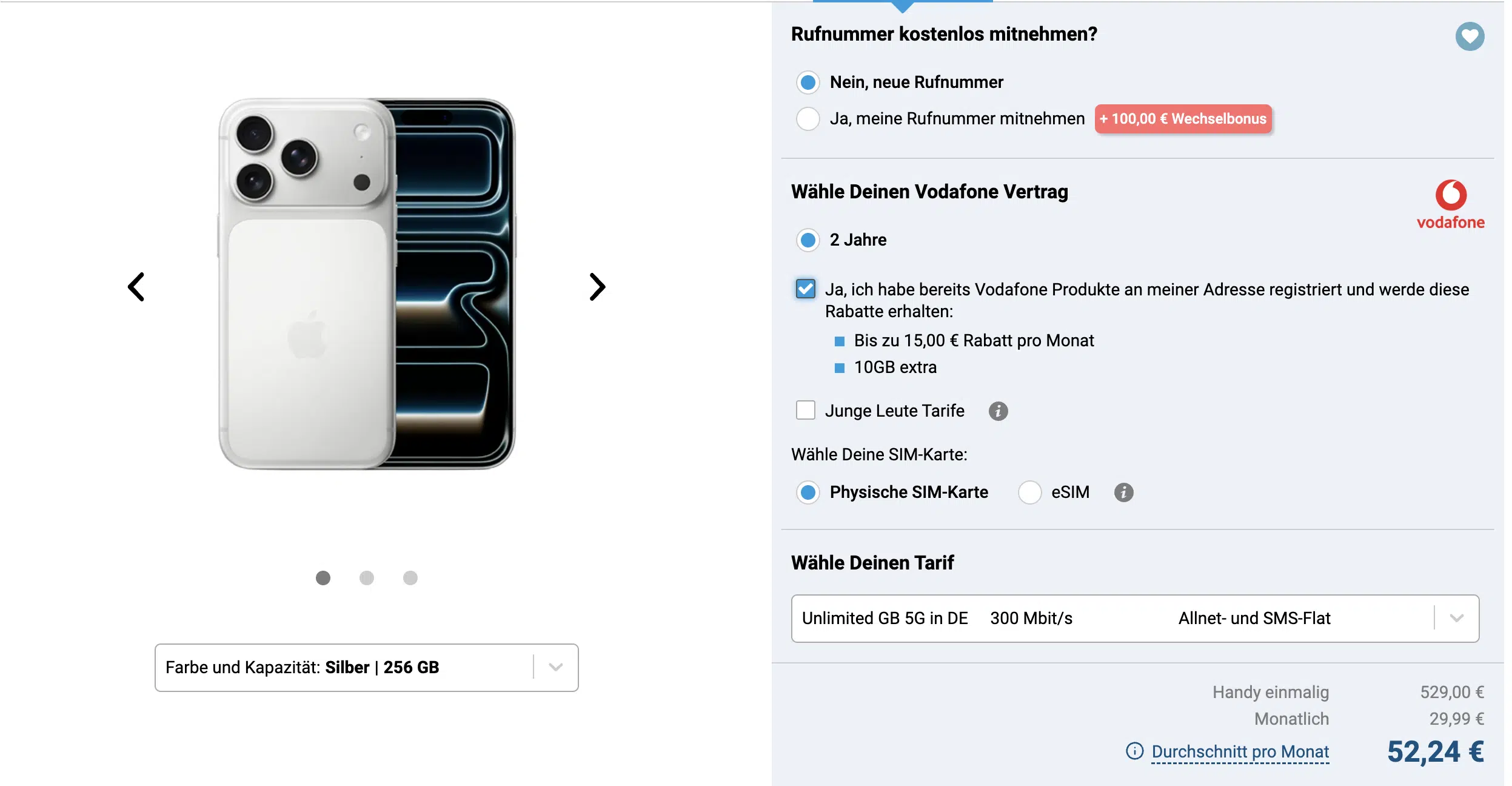 đ€© GigaKombi eff. GRATIS: Apple iPhone 17 Pro (256GB) fĂŒr 529⏠+ Unlimited 5G/LTE Allnet fĂŒr 34,99âŹ/Monat + 100⏠Wechselbonus (Vodafone Smart Lite)