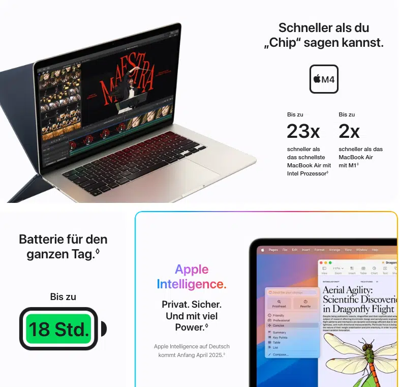 Wer aktuell noch mit einem Intel-Mac oder einem älteren M1-Modell unterwegs ist, wird den Sprung extrem spüren. Gerade die 16 GB Arbeitsspeicher machen das MacBook Air 2025 absolut zukunftssicher.
