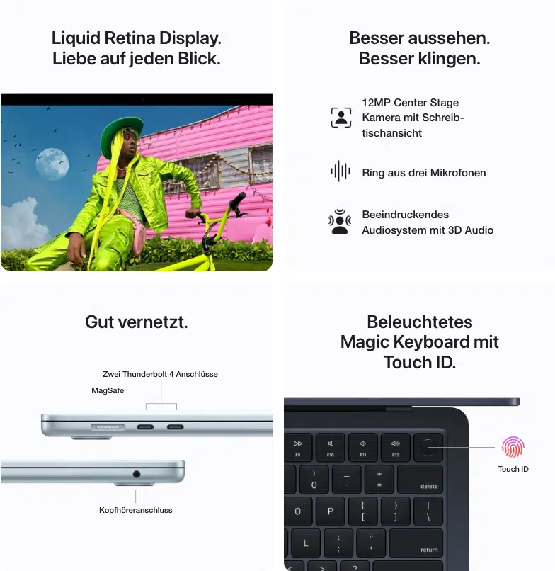 - Anschlüsse: 2x Thunderbolt / USB 4, 3,5 mm Klinke, MagSafe 3