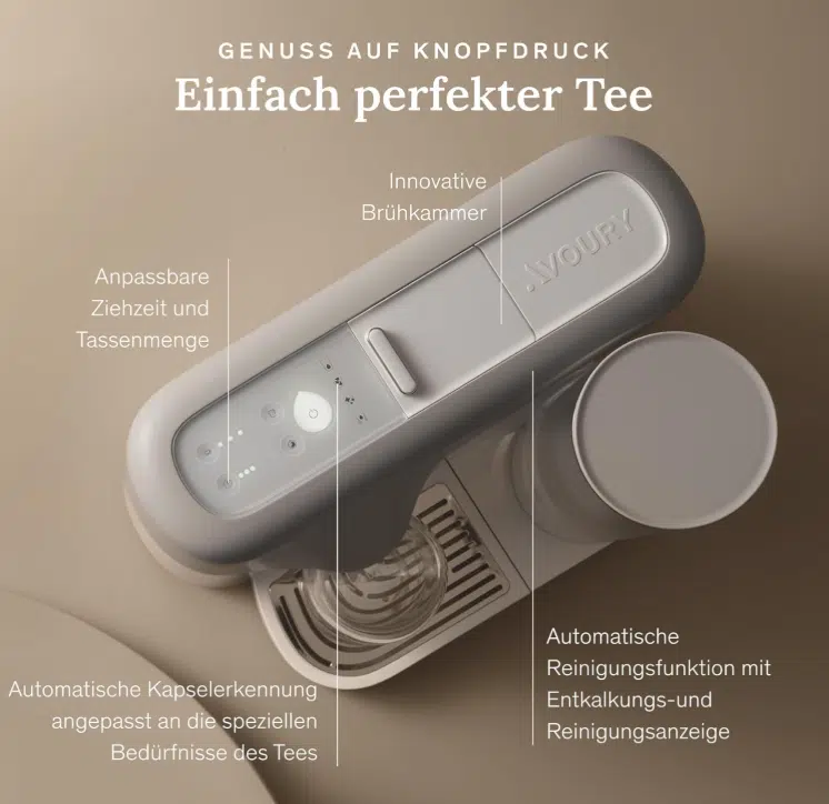 Die Maschine ist nicht einfach ein Wasserkocher mit Kapseln. Avoury nutzt ein eigenes System, das Temperatur, Ziehzeit und Wassermenge automatisch an die jeweilige Teesorte anpasst.