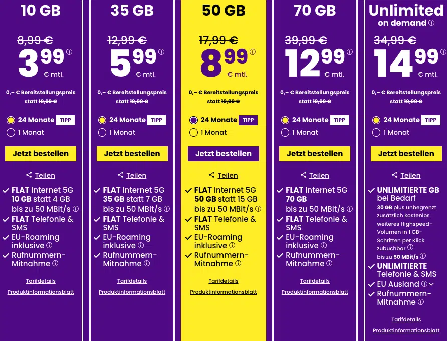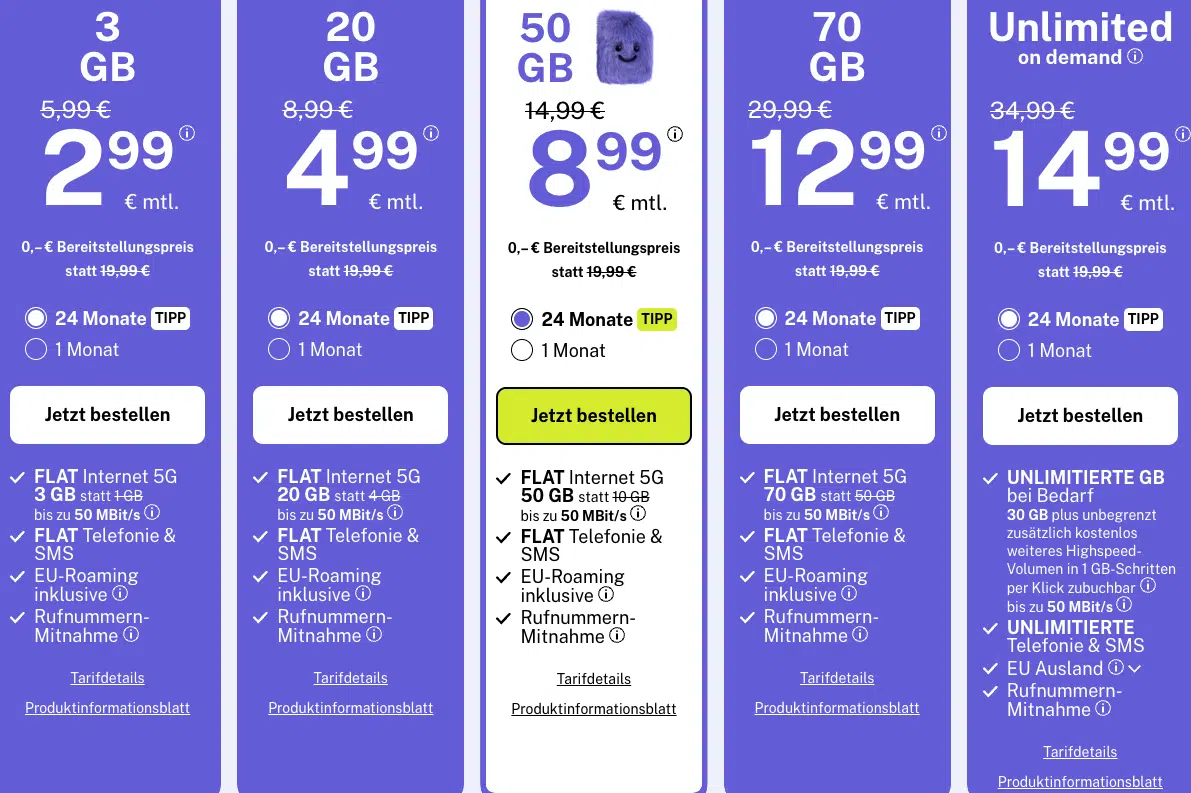 Die Auswahl ist riesig, aber wir haben euch die Rosinen herausgepickt. Besonders der „Kleine“ mit 3GB, der 50GB-Tarif und die Unlimited-Option sind preislich echte Ansagen.
