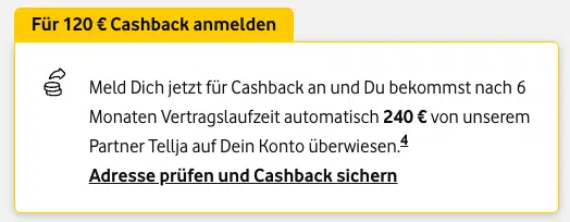 - mit 240€ Cashback statt 120€ (nach 6 Monaten Vertragslaufzeit über Tellja)