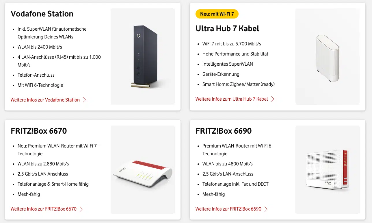 Die günstigste Option ist die Vodafone Station für 3,99€/Monat, mit Wi-Fi 6, SuperWLAN-Optimierung und solider Performance für typische Haushalte.
