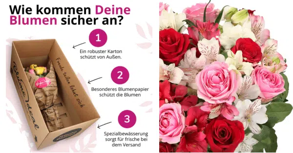 Wenn ihr euch Sorgen macht, ob die Blumen auch frisch ankommen, keine Sorge: Beide kommen in einem speziellen Blumenversandkarton mit Wasserversorgung durch eine FrischetĂŒte. Ihr könnt ganz einfach einen Wunschtermin wĂ€hlen, zu dem sie dann direkt an die HaustĂŒr geliefert werden. Mit einer optionalen GruĂkarte & einem Geschenk (z.B. Schokolade oder ein Teddy) könnt ihr das Arrangement noch etwas erweitern, wenn ihr mögt.