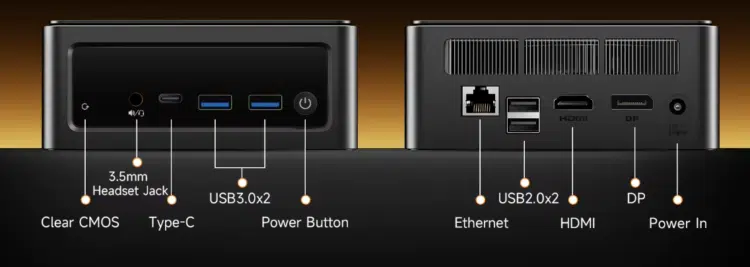 Trotz der kompakten Maße geizt der BMAX B8 A Pro nicht an Schnittstellen. Auf der Vorderseite finden sich zwei schnelle USB 3.2 Gen 2 Ports sowie ein vollwertiger USB-C Anschluss, der nicht nur Daten überträgt, sondern auch als Display-Ausgang dient. Rückseitig gibt es zwei weitere USB 2.0 Buchsen (ideal für Maus & Tastatur, um Interferenzen zu vermeiden) sowie den Gigabit-LAN-Port und die beiden HDMI-Ausgänge.