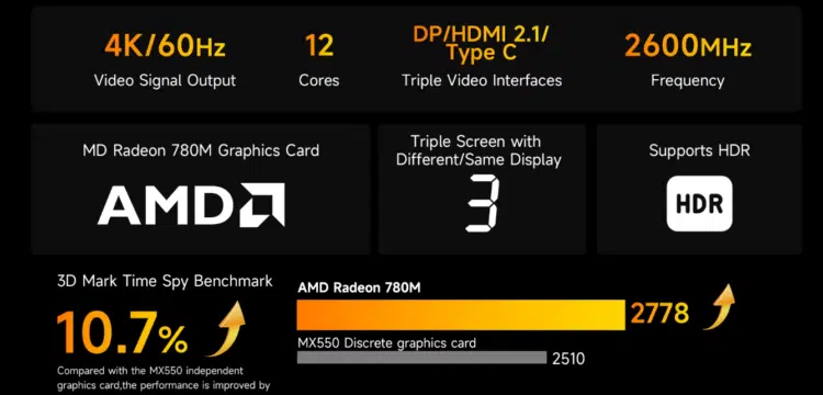 - GPU: AMD Radeon 780M (12 CUs, RDNA 3 Architektur)