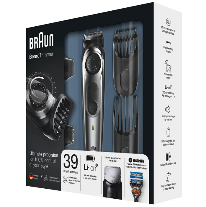 Der Braun BT7040 Barttrimmer ermöglicht das Trimmen der Haare in einer Länge von 0,5 bis 20 mm und bietet dank eines Präzisionsrads sowie 2 Kammaufsätzen insgesamt 39 Schnittstufen. Zudem sorgt der beigefügte Gillette Fusion5 ProGlide Nassrasierer für eine glatte Rasur.