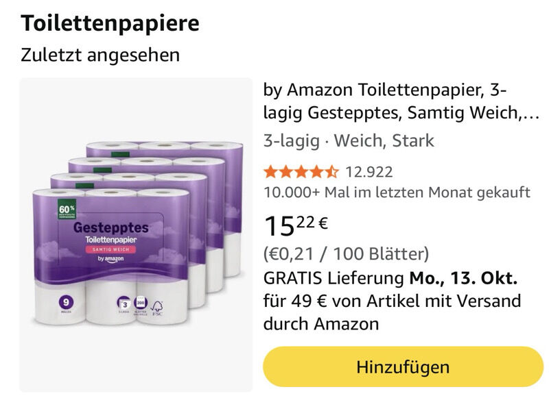 - 144 Rollen by Amazon Toilettenpapier (3-lagig gesteppt, samtig weich) fĂźr 48,70âŹ