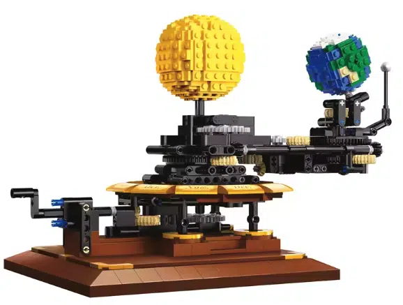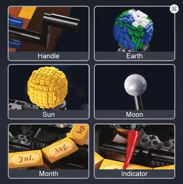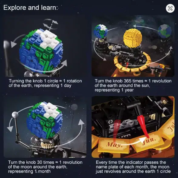 Dieses CaDA-Set ist kein typisches Klemmbaustein-Modell. Hier baut ihr eine komplette Mini-Simulation unseres Sonnensystems – Sonne, Erde und Mond bewegen sich mechanisch durch eine ausgeklügelte Zahnradkonstruktion. Die Erde dreht sich um die Sonne, der Mond kreist um die Erde, und sogar ein Monats-Indikator läuft mit. Das Ganze wird über eine kleine Kurbel bewegt und funktioniert komplett ohne Elektronik.
