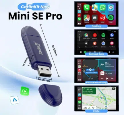 Der CarlinKit Mini SE Pro ist ein kompakter Adapter, mit dem ihr euer Auto schnell und unkompliziert für kabelloses Android Auto und Apple CarPlay nachrüsten könnt. Statt das Smartphone ständig per Kabel anzuschließen, reicht ein USB-Port – der Stick übernimmt den Rest. Für alle, die Wert auf Komfort, Stabilität und einfache Einrichtung legen, ist er eine der aktuell interessantesten Lösungen.