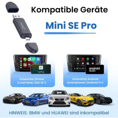 Im Vergleich zu günstigen No-Name-Adaptern bietet der CarlinKit Mini SE Pro klarere Vorteile bei Verbindung und Update-Unterstützung. Das Standardmodell CarlinKit Mini SE ist günstiger, funktioniert aber nur mit CarPlay.