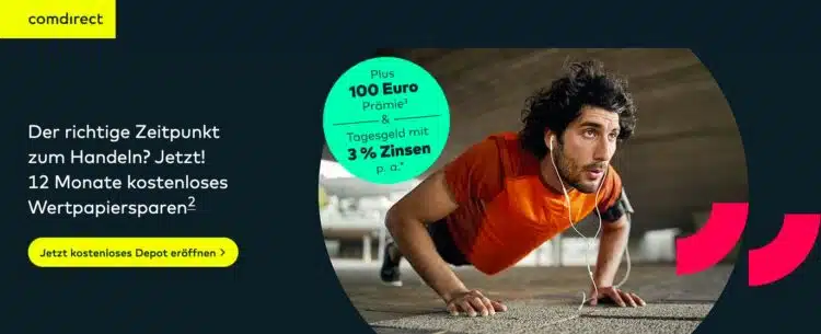 Starkes Angebot der comdirect: Bei Depot-Eröffnung profitiert ihr dort als Neukunden aktuell nicht nur von 100€ Prämie, sondern auch von weiteren attraktiven Konditionen. Ganz neu dabei: Ihr könnt euch jetzt 3% Zinsen p.a. aufs Tagesgeld sichern. Die Depotführung ist für euch kostenlos – und das gleich für die ersten 3 Jahre.