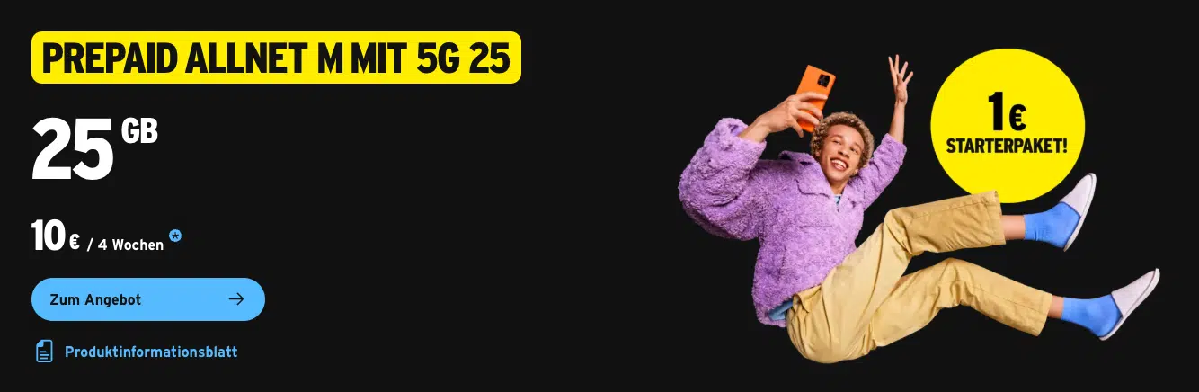 | Prepaid Allnet M | 25 GB | 5G (25 Mbit/s) | 10,00 € | +1 GB mtl. jedes Jahr |