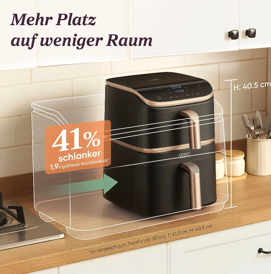 Mit der COSORI CAF-DC123S-DDER und der Ninja Double Stack XL 2-Ebenen Heißluftfritteuse (SL400EU) wildern hier im Prinzip zwei Geräte in derselben Liga: beide setzen auf ein platzsparendes, gestapeltes Design mit zwei Ebenen und sind für Familien bzw. größere Portionen ausgelegt.