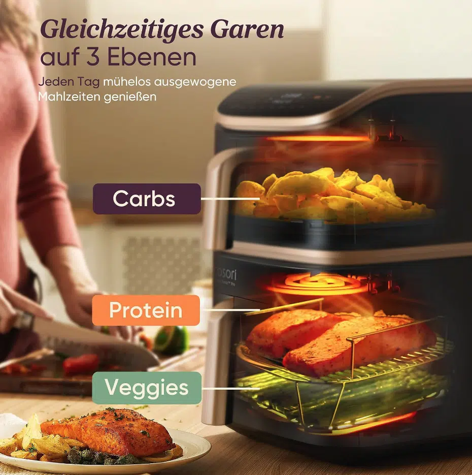 Die COSORI CAF-DC123S-DDER kombiniert starke Leistung mit smartem Design: Zwei Garkörbe übereinander sparen Platz, bieten aber dennoch reichlich Kapazität (6,5 l + 4,3 l). Ideal also für Familien oder alle, die gerne mehrere Speisen gleichzeitig zubereiten.