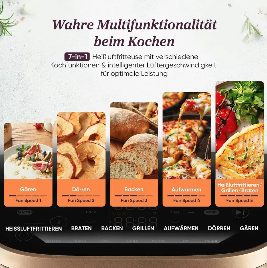 - COSORI: 7 Kochfunktionen (u. a. Air Fry, Backen, Dörren, Grillen, Rösten, Aufwärmen), großes LC-Display mit Touch, Sync- und Match-Funktion, App-Steuerung via VeSync inkl. Rezepte.