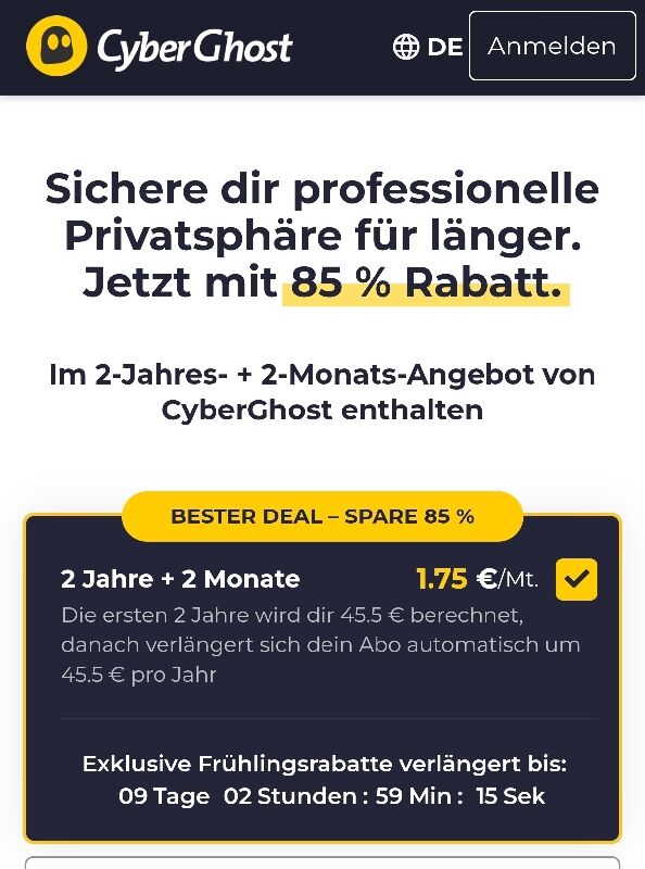 @DealDoktor (Bjoern): Ich habe vorhin den Deal abgeschlossen und da lief bei CyberGhost ein Timer ab. Noch 9 Tage…, also vermutlich noch bis 31.03.2026. Es sind auch 2 Jahre + 4 Monate ausgewiesen gewesen.