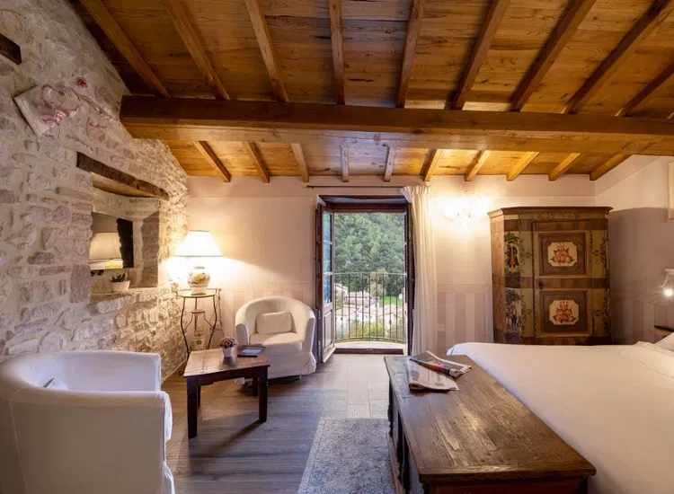 Ihr übernachtet nicht in einem einzigen Gebäude. Das Torre Del Nera ist ein sogenanntes Albergo Diffuso. Das bedeutet, eure Zimmer und Suiten verteilen sich auf verschiedene historische Steinhäuser im Dorfkern von Scheggino. Teilweise wohnt ihr sogar in einem Turm aus dem 13. Jahrhundert! Ihr seid also mittendrin und werdet Teil der Dorfgeschichte, ausgestattet mit Landhausstil, Holzbalken und oft auch Kamin.