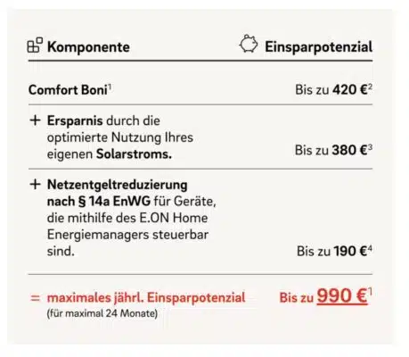 E.ON wirbt damit, dass ihr mit einem Tarif bis zu 990€ pro Jahr sparen könnt! Dieser Betrag setzt sich aus verschiedenen Bestandteilen zusammen.