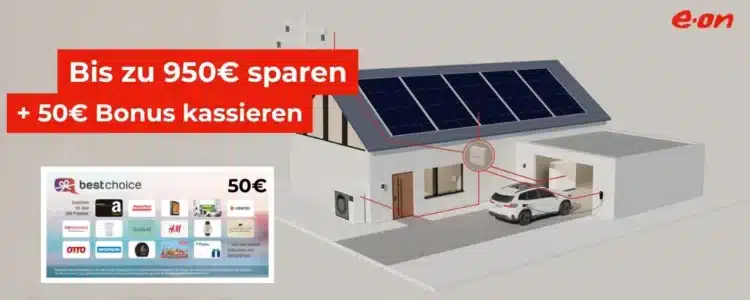 Für jede Energielösung in eurem Haushalt schenkt euch E.ON einen Bonus in Höhe von bis zu 240€ pro Jahr. Zusätzlich profitiert ihr von niedrigen Energiepreisen und kassiert für Abschluss eines Stromvertrags auch noch einen Bonus in Höhe von 50€!