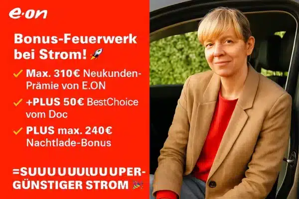 ABGELAUFEN ⏰ENDET! 🤯 E.ON Stromtarif mit MEGA-BONUS – speziell für E-Auto Fahrer! 🚗 Bis zu 310€ Neukundenbonus + 240€ Nachtlade-Bonus +50€ vom Doc 🔌effektiver Strompreis ab 0,23€/kWh inkl. Grundgebühr