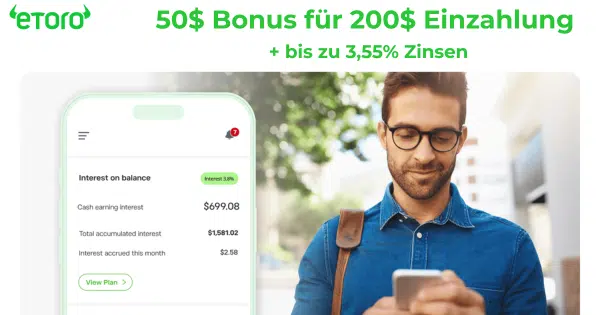 đ° 50$ Bonus fĂŒr 200$ Erst-Einzahlung bei eToro + bis zu 3,55% Zinsen