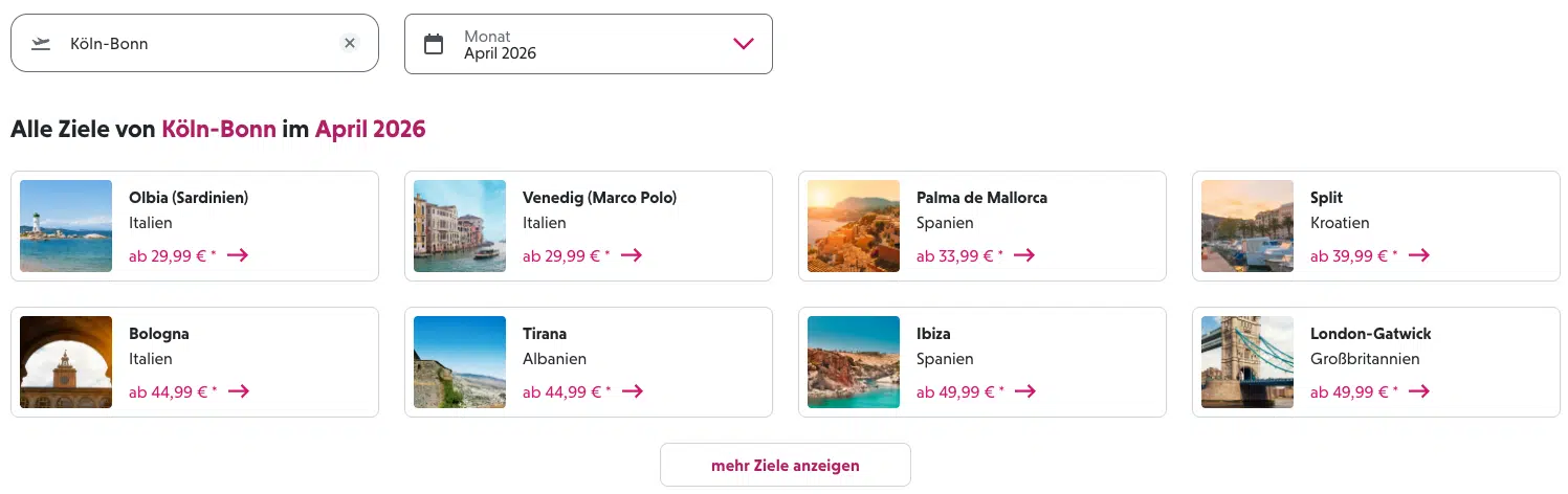 Gerade die beliebten Wochenend-Termine im April sind bei Preisen ab 29,99€ erfahrungsgemäß schnell vergriffen. Prüft am besten direkt eure Wunschdaten ab eurem nächsten Flughafen.