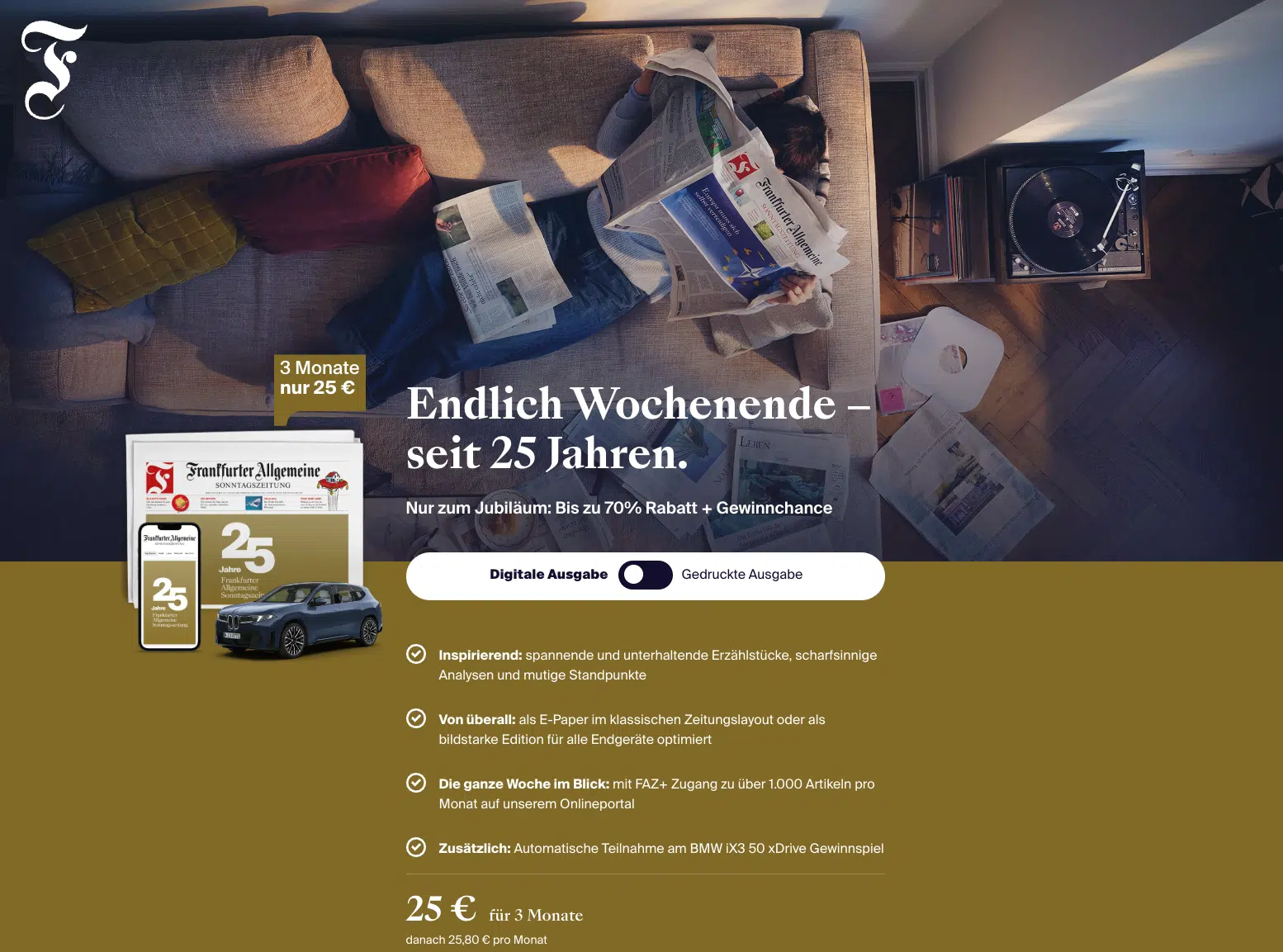 Die Frankfurter Allgemeine Sonntagszeitung steht seit 25 Jahren für kluge Analysen, starke Meinungen und erstklassige Unterhaltung am Sonntag. Mit diesem Deal holt ihr euch nicht nur die Sonntagslektüre ins Haus (oder aufs Tablet), sondern bekommt das volle digitale Paket der F.A.Z. direkt dazu.