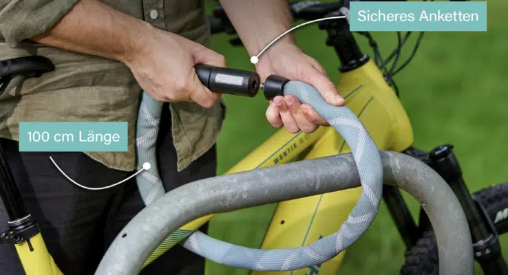 Das Schloss wurde aus legiertem Stahl gefertigt und verspricht ein sicheres Anketten. Es ist wetterbeständig und rostfrei, sodass ihr euer Rad auch unbesorgt im Regen stehen lassen kĂśnnt. Die Länge des Schlosses beträgt 1 Meter.Â
