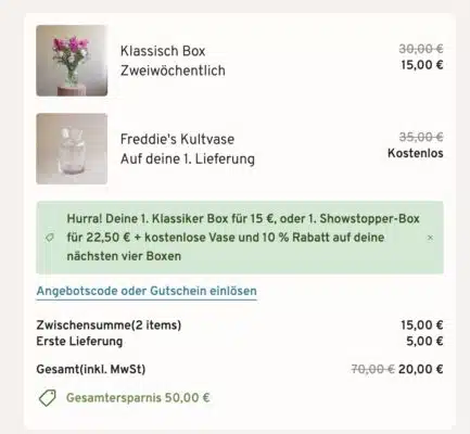 Viel Freude mit eurem blumigen Schnäppchen! Falls ihr Fragen zum Abo habt, schaut in die FAQs oder schreibt uns einfach.