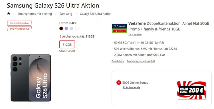 Ganz ehrlich: So einen Deal sieht man nicht alle Tage. đ€Ż Ihr schnappt euch hier das brandneue Samsung Galaxy S26 Ultra mit satten 512GB â und am Ende bleibt unter dem Strich sogar ein Plus fĂŒr euch ĂŒbrig. Möglich macht das die Kombi aus Doppelkartenaktion, starken Boni und einem ohnehin schon extrem attraktiven Gesamtpaket im Vodafone-Netz.