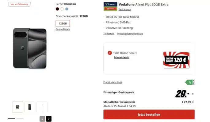 Bei MediaMarkt könnt ihr das Google Pixel 10 Pro mit 128GB zusammen mit einer 50GB Vodafone Allnet Flat für nur 29€ Zuzahlung bekommen! Der Tarif kostet nur 279€/Monat und obendrauf gibt’s noch einen 120€ Online-Bonus.