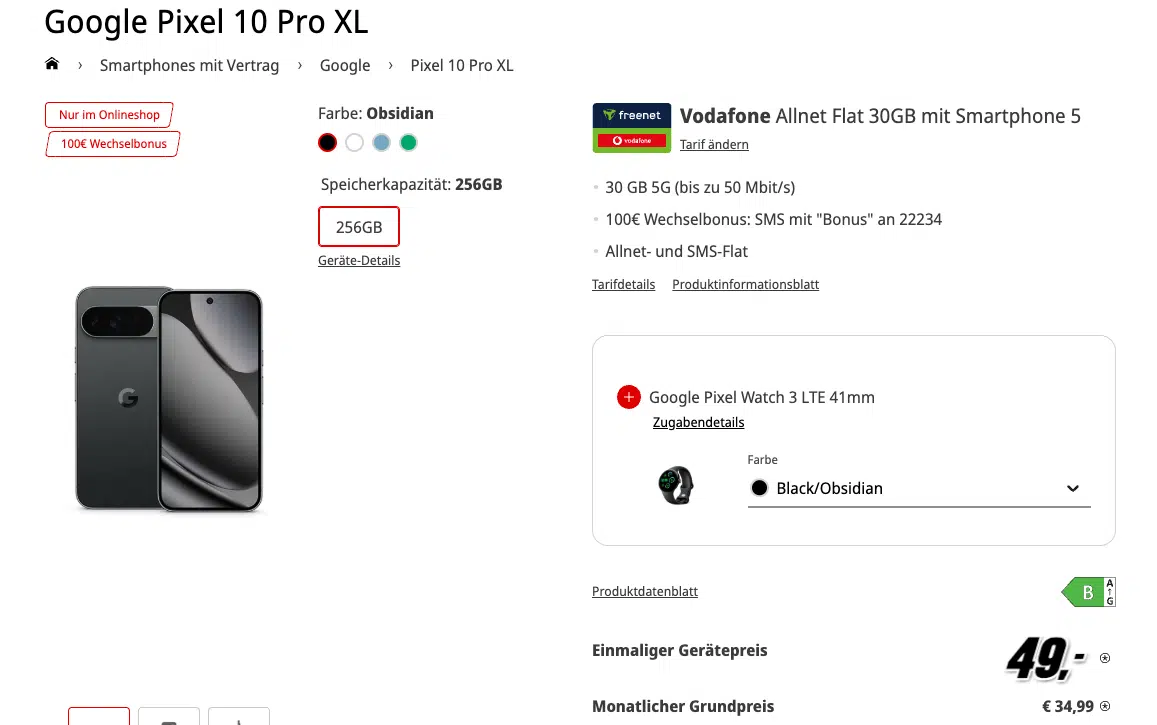 - Google Pixel 10 Pro XL (256GB) + Pixel Watch 3 LTE für 49€