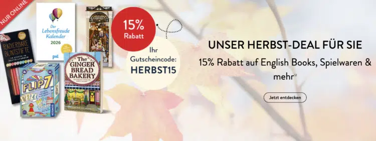 Bei Hugendubel läuft gerade ein schöner Herbstale, bei dem ihr auf verschiedene Kategorien 15% Rabatt erhaltet! Wenn ihr also auf der Suche nach neuem Lesestoff oder Spielwaren seid, ist jetzt genau der richtige Zeitpunkt gekommen, um dort mal vorbeizuschauen und euch durch das Sortiment zu stöbern! 🤭