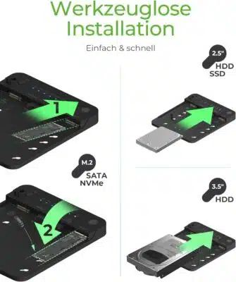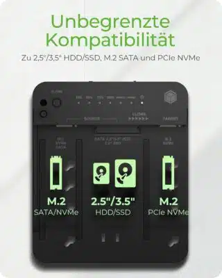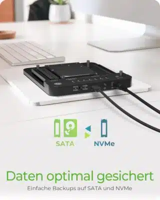 - Unterstützte Formate: 2,5″/3,5″ HDD & SSD (SATA), M.2 PCIe NVMe SSD